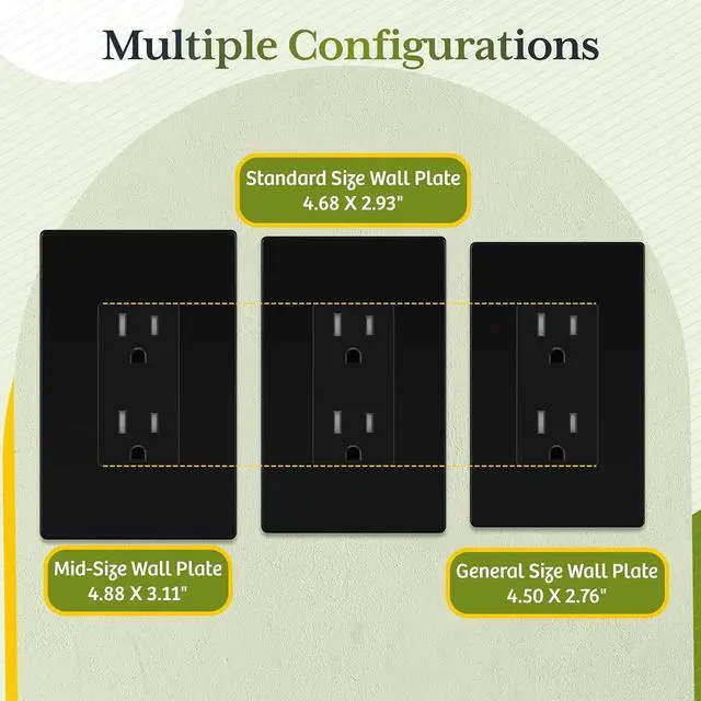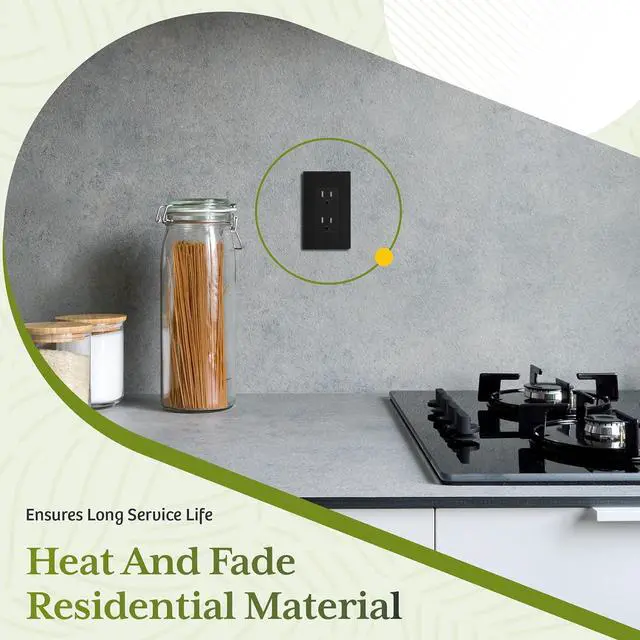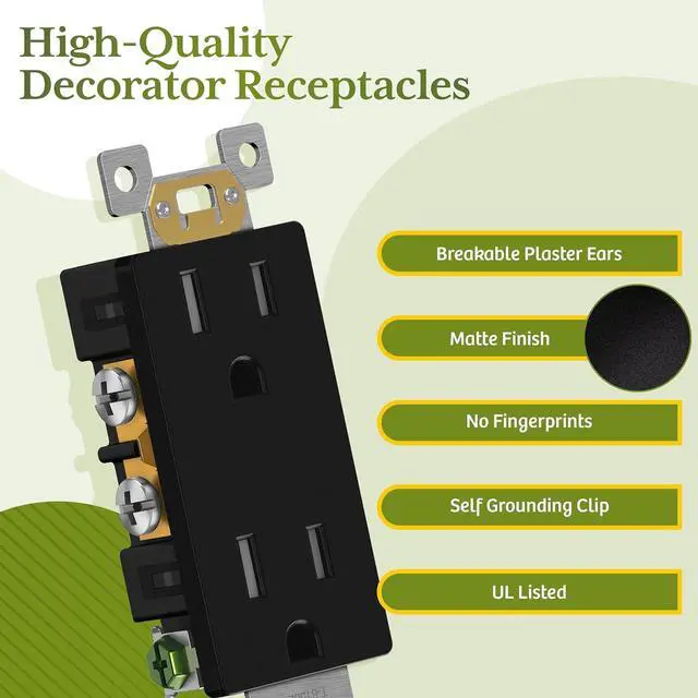 - Matte black color; 15A 125VAC, 5-15R; flammability UL94, V2 Rating; UL Listed; 1-year warranty; Matte white screwless wall plate include; 20 Pack