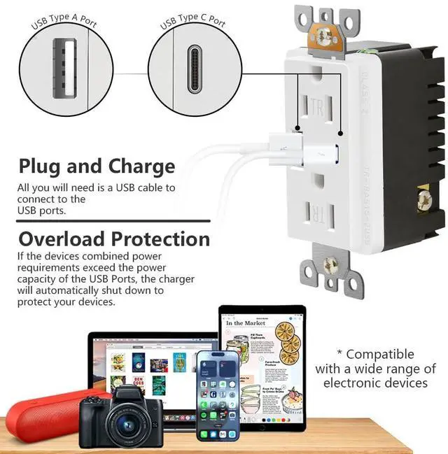 Universal Compatibility - The Type A and Type C USB charging ports boast a combined output of 5V DC, 4.8A. Compatible with various USB devices featuring multiple charging protocols. Meets diverse charging requirements, ensuring your devices charge rapidly.