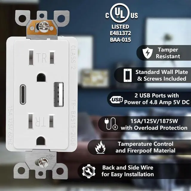Safety - The POWAWINI USB Outlet UL#: E481372, BAA-015, 15 Amp, 125 Volt, 60HZ standards. Crafted from fire and impact-resistant polycarbonate thermoplastic housing, suitable for residential and commercial settings like homes, schools, offices, hotels, and restaurants.