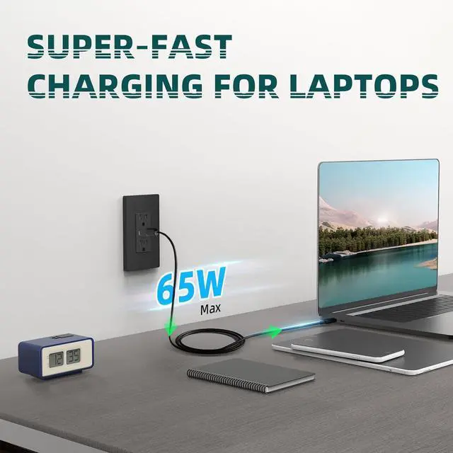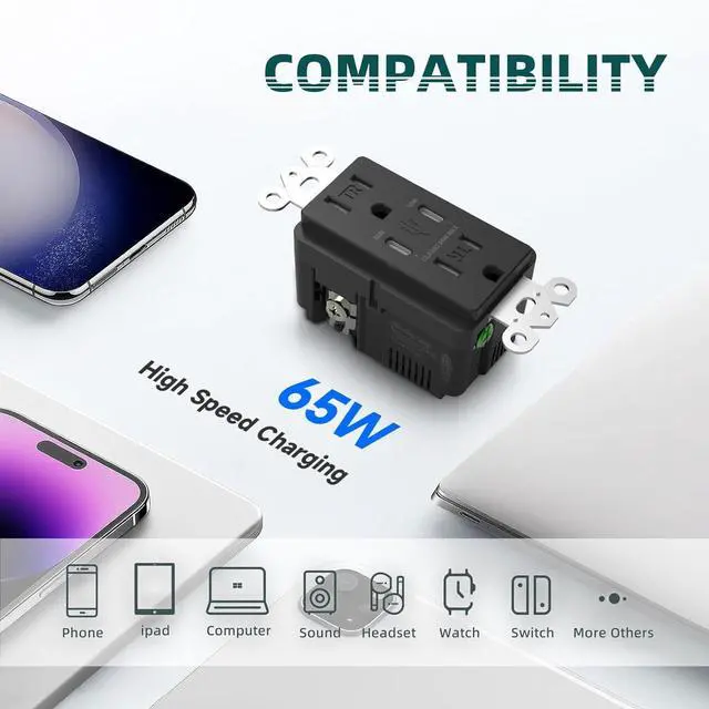 Up to 65W USB C receptacle with PD charging technology. Delivers fast, efficient charging for laptops, tablets, and phones. Supports Apple 20W and Samsung PPS 45W for quick, reliable power to all your mobile devices. Perfect for home or office use