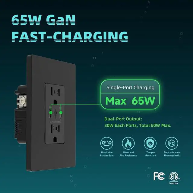 Safe & Reliable USB electric outlets with advanced GaN chip boosts efficiency with 90%+ power conversion and less heat. Built-in protection guards against overcharge, overheat, overcurrent and overvoltage. Reliable, powerful, and safe