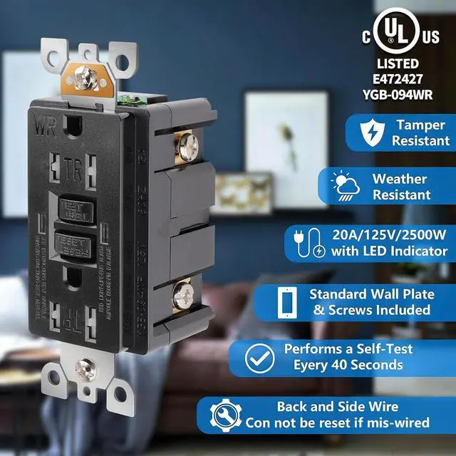 Safty - The POWAWINI GFCI Outlet UL Listed #: E472427, YGB-094WR, 15 Amp, 125 Volt, 60HZ. Tamper Resistant Receptacle prevents young children from inserting unwanted objects into the outlets. For an added layer of protection, the GFCI regularly conducts an automatic internal test to confirm that it can respond to a ground fault, provides continuous ground fault protection.