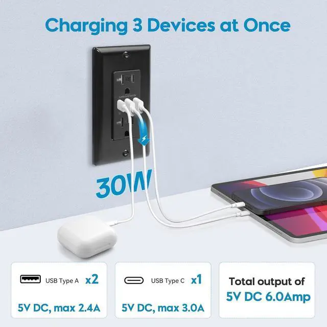 MULTI-PORTS CHARGING - In-wall 3-Port USB charging outlets with output of 5V DC 3.0A USB Type-C Port and 5V DC 2.4A USB Type-A Port (Total 6.0A / 30W Maximum Output); Perfect for Family Charging Needs