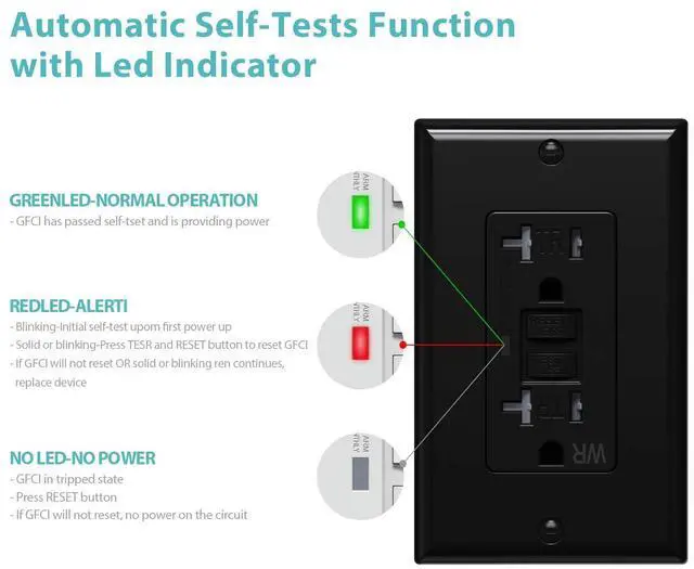 Green LED indicator should always be ON, but Red LED will flash 1 time each 8-10 Seconds it means self-test 1 time. Only if GFCI is malfunctioning, the Green LED indicator will turn OFF, and the Red LED indicator will light up. When the TEST button is pressed, the flow of electricity should be stopped, and the RESET button would be pop-out. To restore power, press the RESET button.