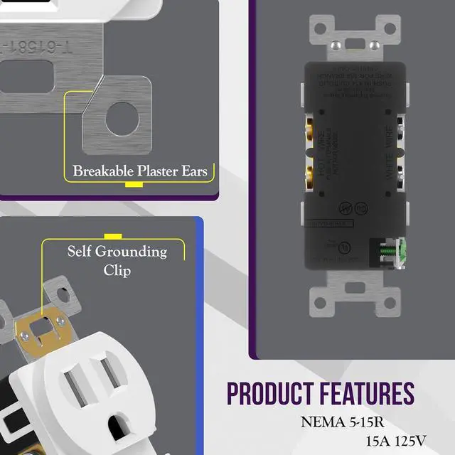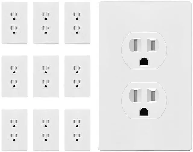 10-pack; white color; matching screwless wall plates included; 15A 125VAC, 5-15R; flammability UL94, V2 Rating; wiring method choice of back insert or side screw terminals; break-off plaster ears for easy positioning and firm attachment; installation instructions included; UL Listed; 1-year warranty