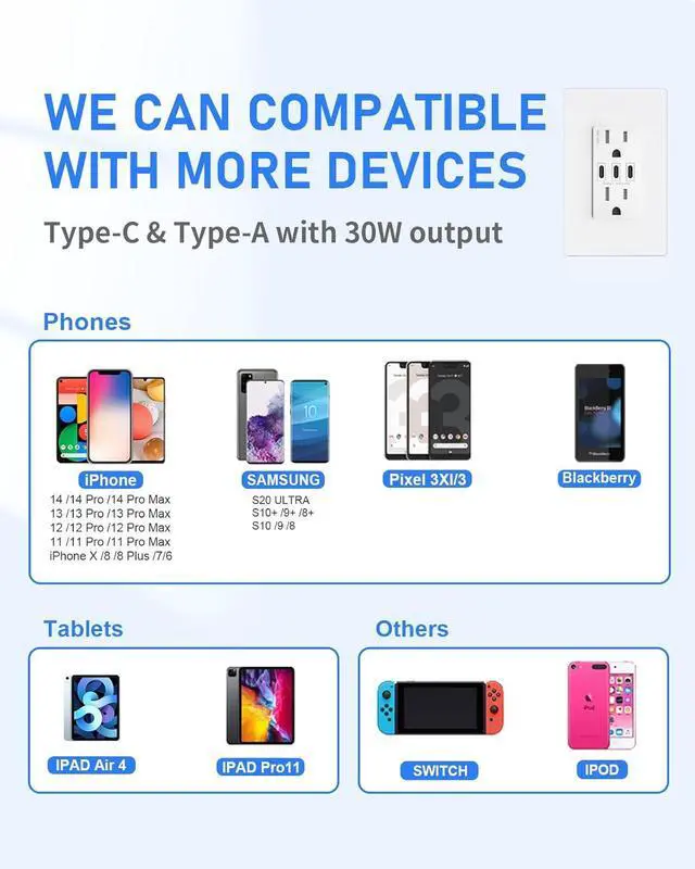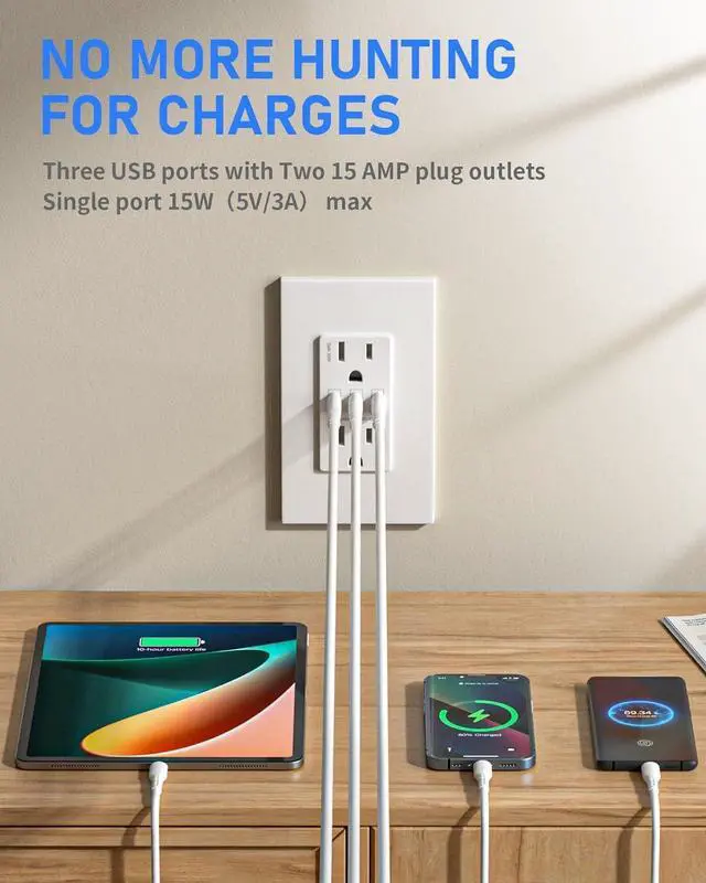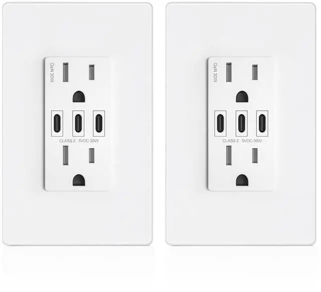 Fast charging & PowerUp to 30W max(single port up to 15W, 5V/3A), this wall outlet charger with 3 USB-C can provide fast charge for three devices simultaneously. (Not for laptop)