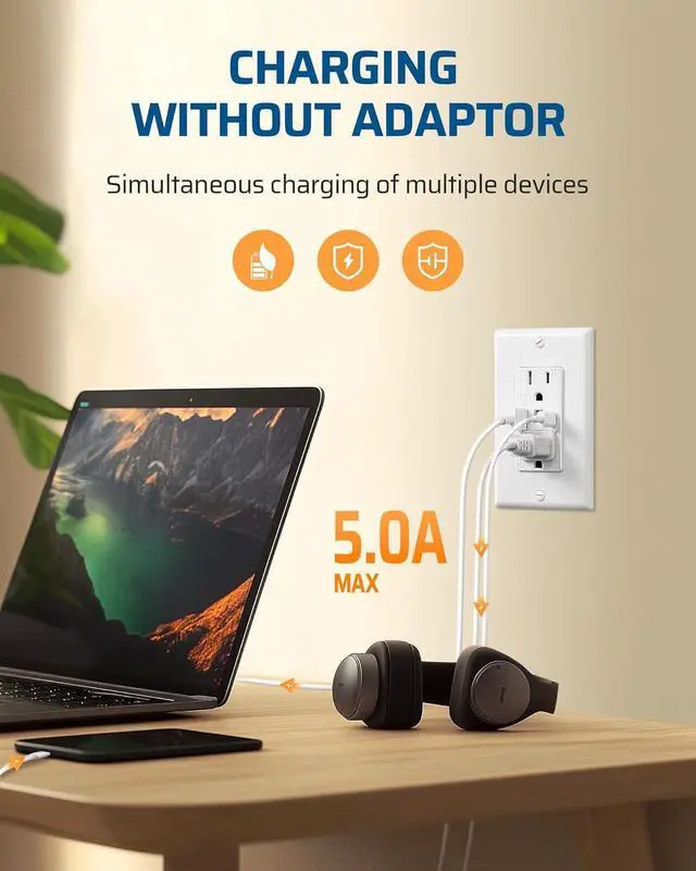 [Fast Charging] No adapter needed for fast charging of phone, iPad, and other electronic devices; the USB wall outlet offers 5V 4.8A total output, with each port delivering up to 4.8A for rapid charging
