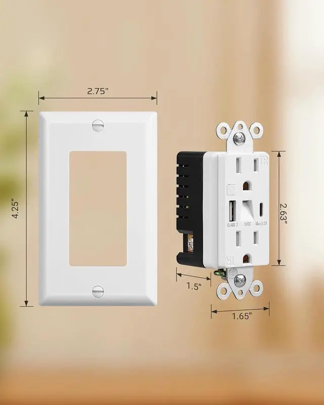 [Easy to Install] This 15A 125V 60Hz dual power outlet with USB ports features both back and side wiring, making installation a breeze; fits into standard wall boxes and comes with a white wall plate and screws
