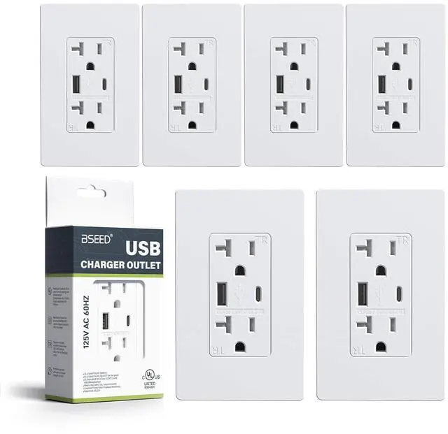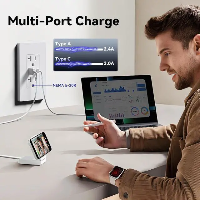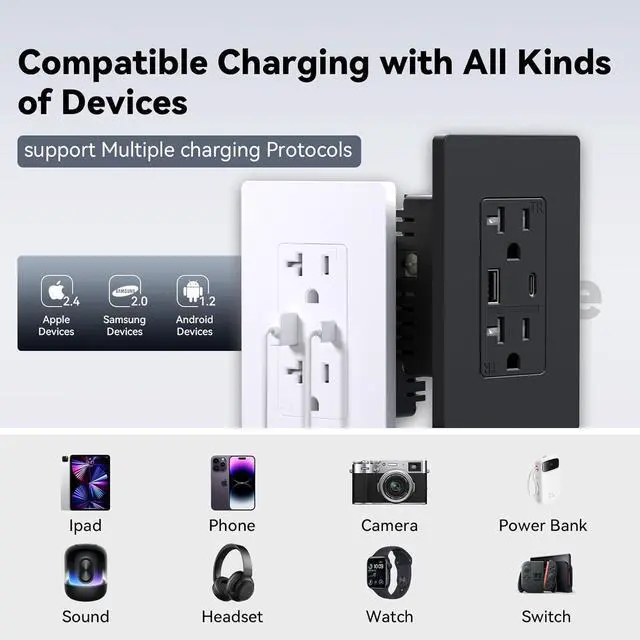 USB Wall Charger: Featuring a USB Type-A port with a 2.4A output current per port and a USB Type-C port with a 3.0A output current per port, along with two 20A tamper-resistant power outlets. Fast charging technology is not supported.