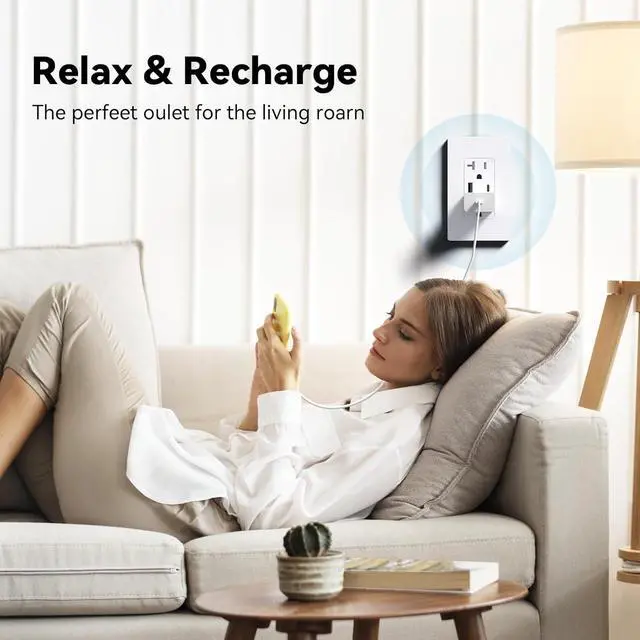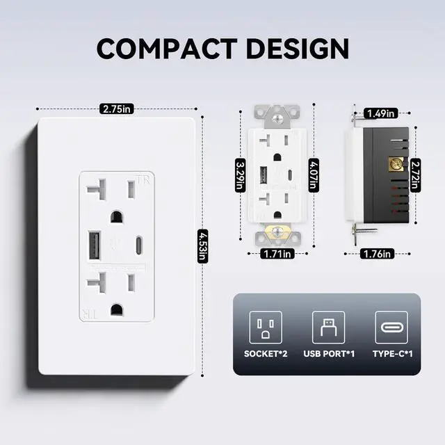 Easy Installation: The slim body fits standard junction boxes, facilitating easy installation or replacement. 2 wiring methods are supported, including side wiring and back wiring. Compatible with standard wall plates, it can also be multi-ganged with other devices. The installation provides more maneuvering space and reduces stress-induced damage to USB cables.