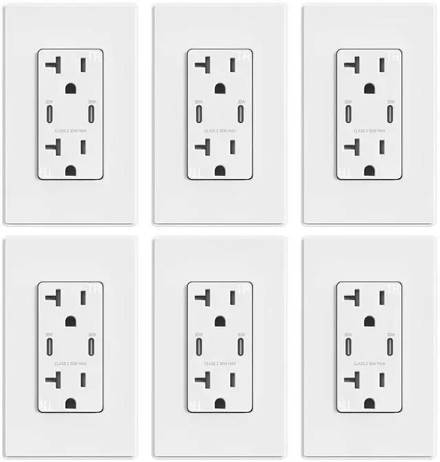 ELEGRP USB Outlet Receptacle, 30W Fast Charge & Power Delivery USB C Wall Outlet, 20 Amp Wall Outlet with USB C Ports, Tamper Resistant, UL Listed, Wall Plate Included, 6 Pack, Matte White