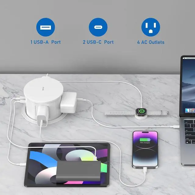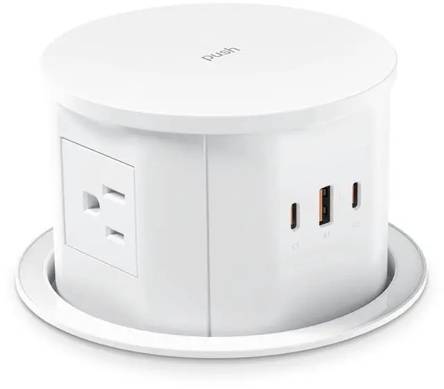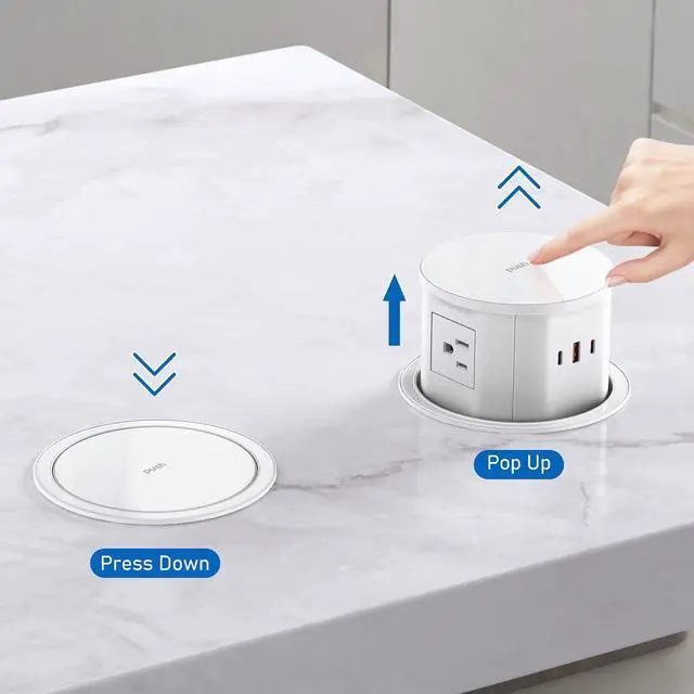 Space Saving & Stylish: This innovative pop up countertop outlet hides discreetly under your countertop, designed to blend into your decor. Simply press the panel, and it pops up to reveal all charging ports. Perfect for kitchen, office, or any spaces where style meets functionality.