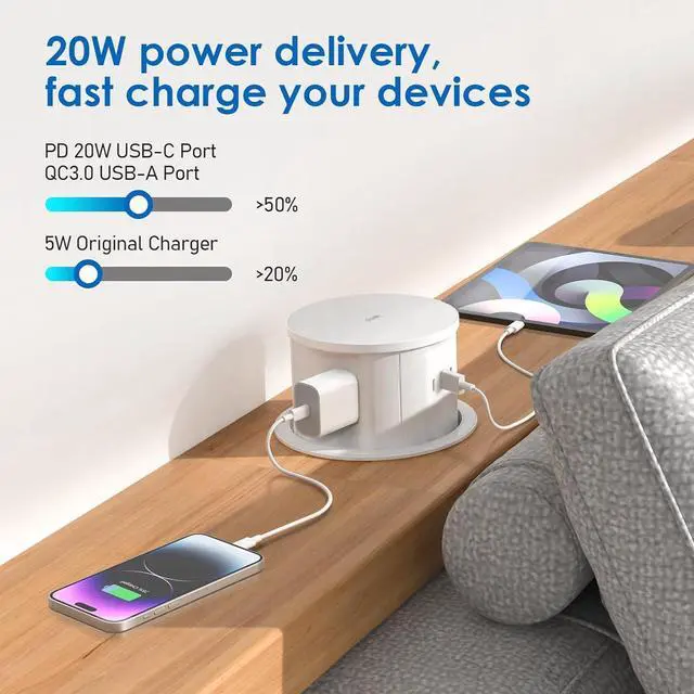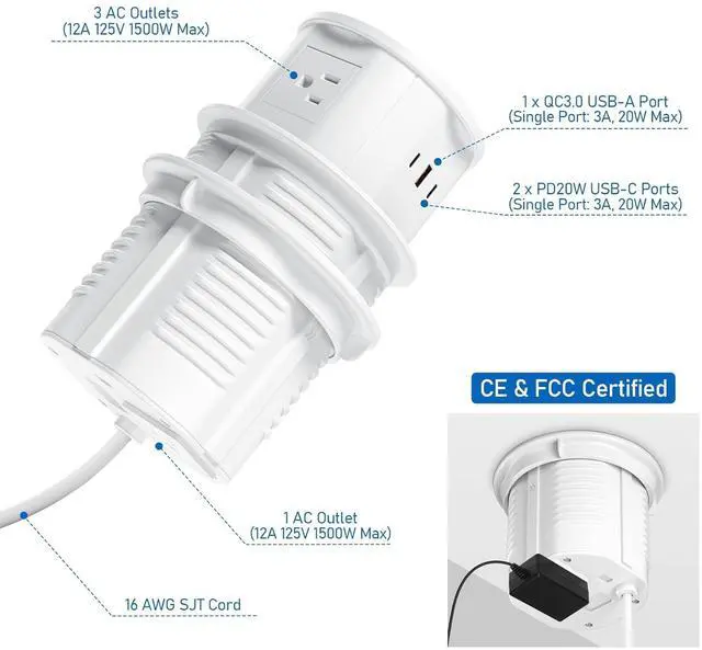Fast Charging: Need power in a hurry? The built-in USB ports in this pop up outlet for countertop deliver up to 20W of power, ensuring your devices charge at lightning speed. Perfect for phones, tablets, and other