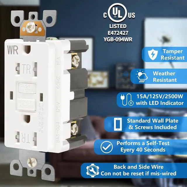 Safty - The POWAWINI GFCI Outlet UL Listed #: E472427, YGB-094WR, 15 Amp, 125 Volt, 60HZ. Tamper Resistant Receptacle prevents young children from inserting unwanted objects into the outlets. For an added layer of protection, the GFCI regularly conducts an automatic internal test to confirm that it can respond to a ground fault, provides continuous ground fault protection.