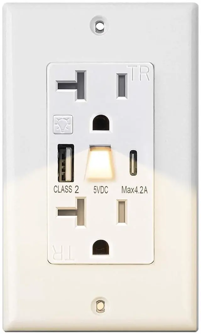 Easy Installation & Modern White Design Function: USB Outlet with Light Includes 2 Outlet Cover with Light and 2 plates. Sleek Wall Outlet, minimalist white finish matches any decor. Upgrade old outlets in living rooms, kitchens, or home officesseamless and professional look.