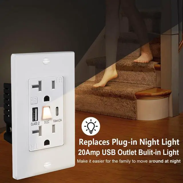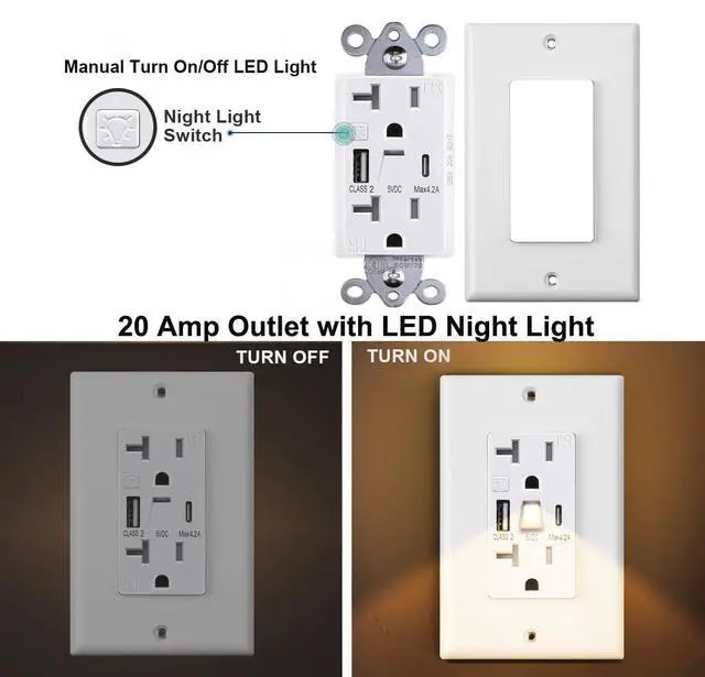 20Amp Outlet with Night LightFOURHARVEST 20Amp Outlet Built-in adjustable night light with manual on/off switch for brightness. Instantly light up stairways, kids rooms, or hallwayssafely navigate at night without harsh lighting.