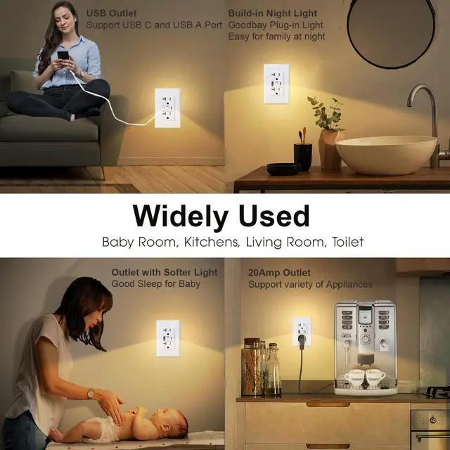 Wide-Spaced 20A AC Outlets Fit Large Plugs Easily Wide Spaced Outlet, Extra-wide spacing between outlets accommodates two bulky plugs (e. g., air fryer + Instant Pot). 20A power handles high-wattage appliances while charging phones/tablets via USB. Kitchen Outlet with USB, Kitchen