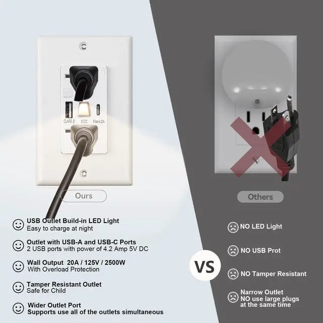 Childproof & Tamper-Resistant Safety Outlet Design Safety shutters block accidental insertion of objects; Durable build for long-term use. Safely install in nurseries, playrooms, or garagesprotect kids while using night lights or tools.