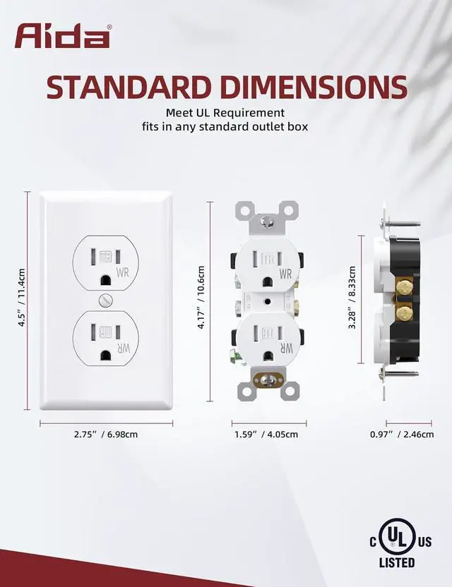 & Experience superior quality with our outlet cover featuring high-impact resistant thermoplastic material that eliminates cracks and breaks, ensuring a finger-safe application before, during, and after installation. Our AIDA duplex receptacle is UL-listed and has undergone rigorous quality testing to meet the highest industry standards of safety and performance, giving you peace of mind and an added level of safety for your electrical system.