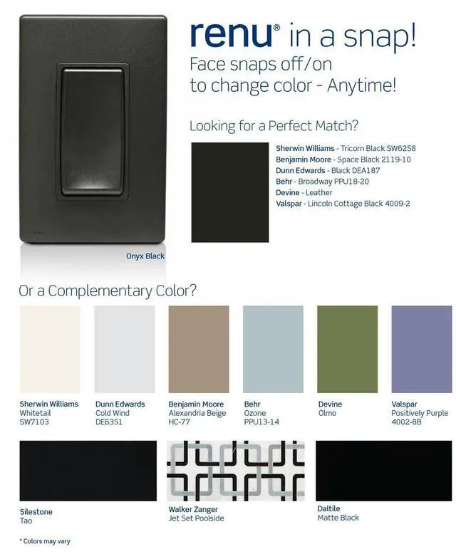 Once installed, Renu 20A outlets can be updated to a new color by ordering an RKR20 color change kit, available in 20 designer colors