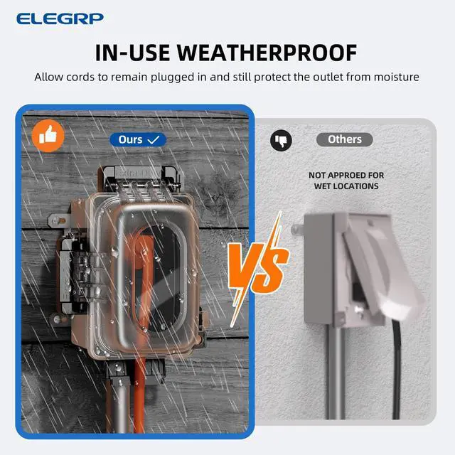 ·Weatherproof & In-Use ConvenienceThe versatile in-use cover supports horizontal or vertical installation, safeguarding your outlet from rain, dust, and debris even while in use. The lockable tab allows for added security with a full-size padlock, keeping your appliances safe and operational.