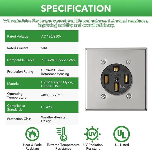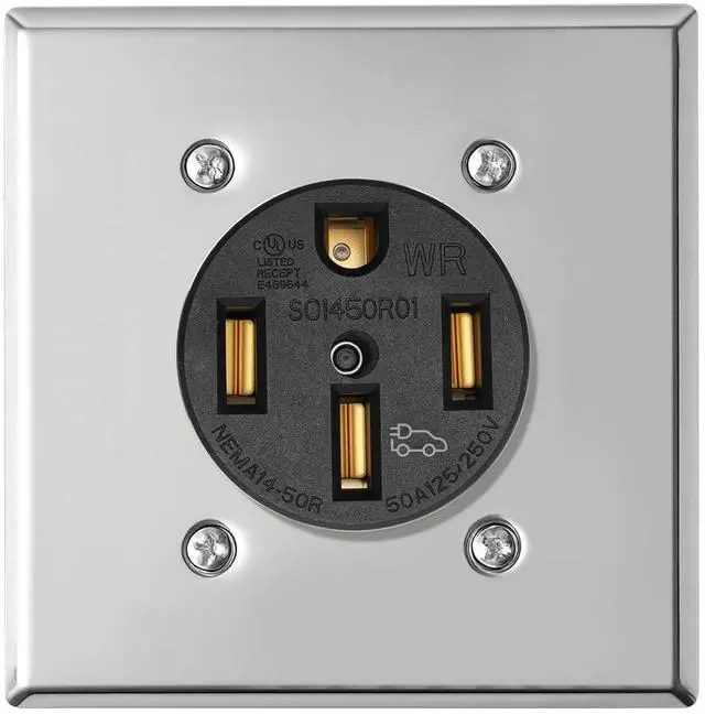 Weather-Resistant Wall Plate Outlet KitThis NEMA 14-50WR outlet kit comes with a stainless steel wall plate, suitable for high-power applications at 125/250 volts and 50 amps, specifically designed for electric vehicle charging, industrial, commercial, and residential use, UL listed. Made from high-strength nylon and flame-retardant thermoplastic, it resists UV aging in extreme conditions from -40°C to 75°C.