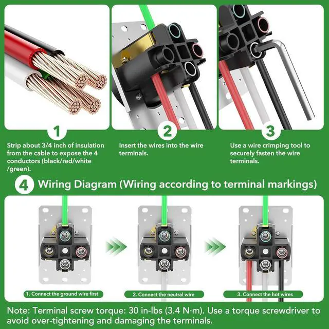 Wire Size Compatibility: Supports #6 to #4 AWG solid copper wire (do not use aluminum wire). Industrial-grade thick brass terminals ensure good contact, reducing the risk of poor connections and fire, while providing zero loss current transmission. The terminal screw installation torque is 30 IN. -LBS, ensuring a reliable connection.