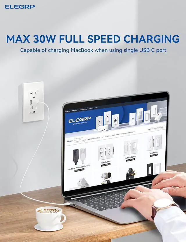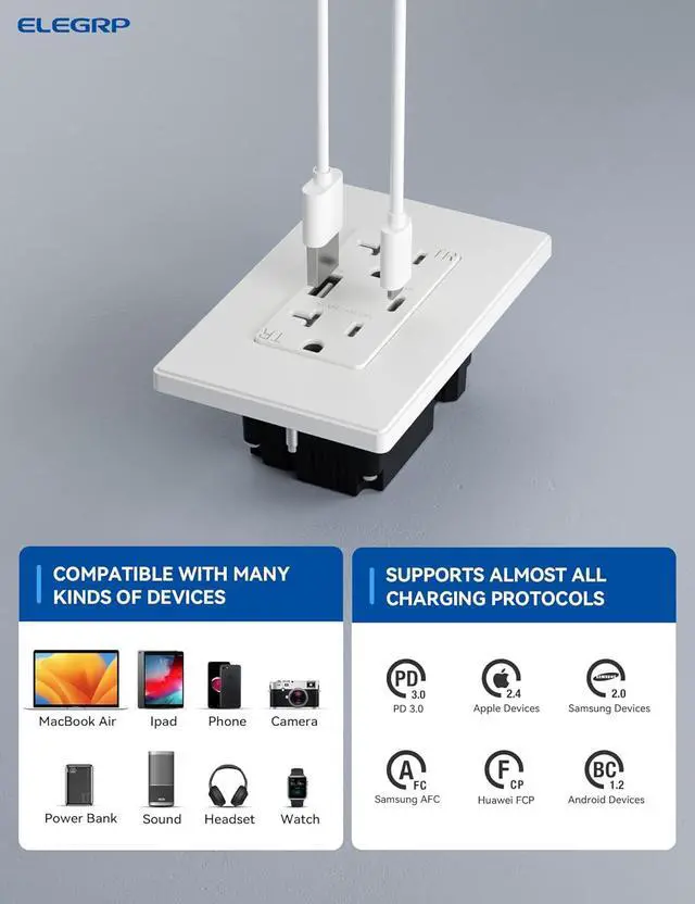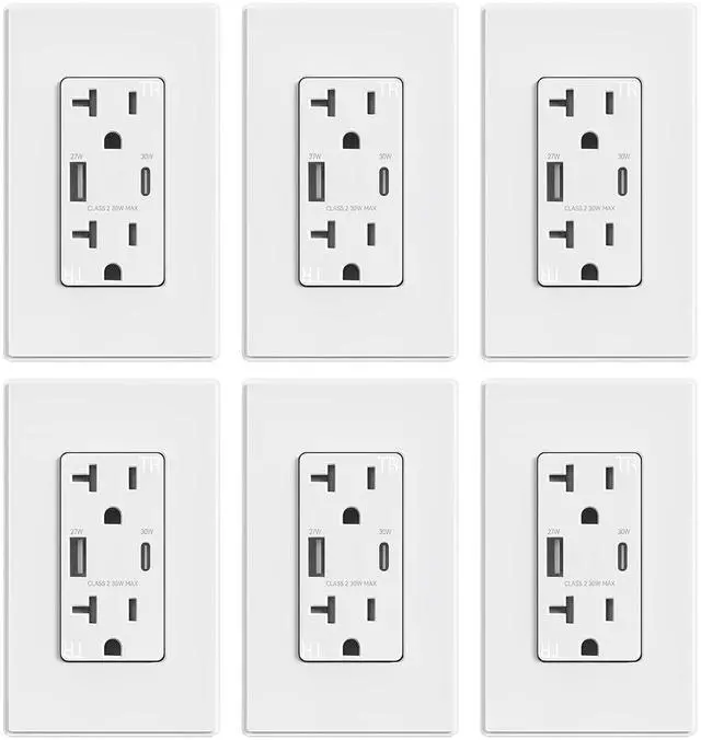 ELEGRP 30W USB Outlet Type A/C, Fast Charge Wall Outlet with 2 USB Ports, Power Delivery 20 Amp Wall Outlet with Tamper Resistant, UL Listed, Wall Plate Included, 6 Pack, Matte White