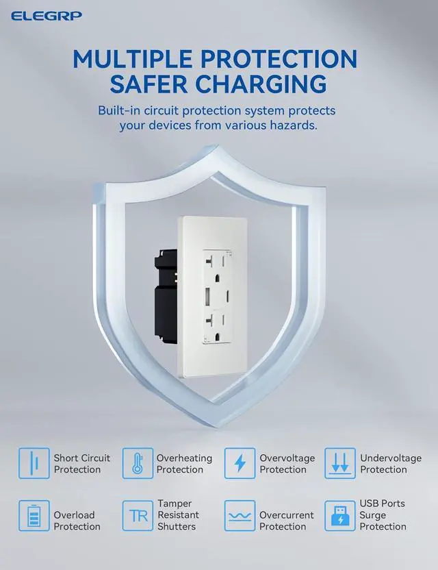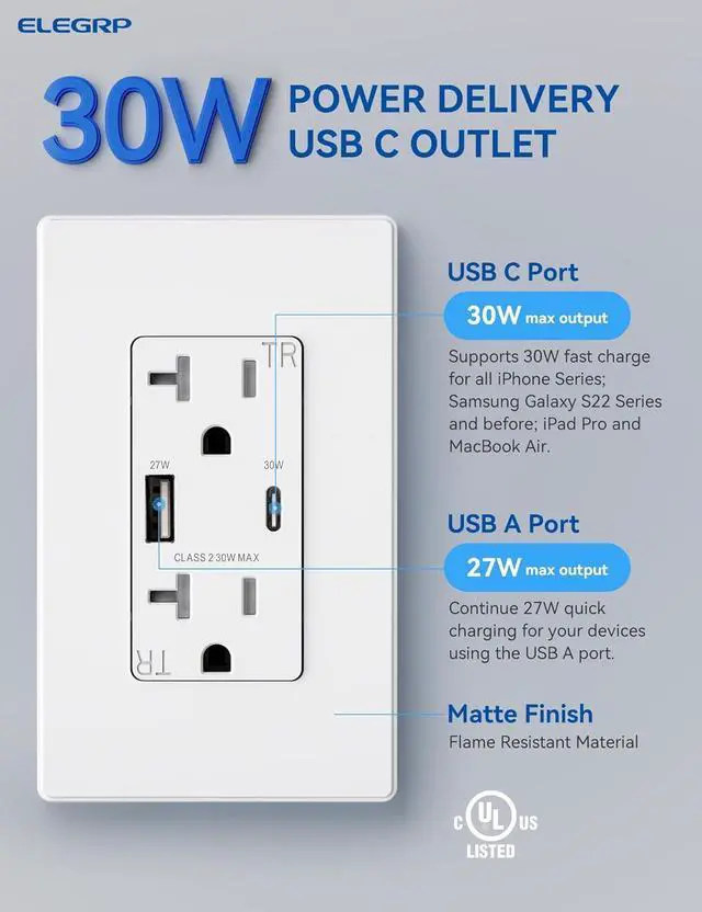 Durable Design Exquisite matte finish and frameless design looks best with today' s decors. Tough thermoplastic housing shrugs off impacts and scratches. Heavy duty design is made to last. Works with 12 or 14 AWG for back wiring. Replace an existing outlet in as short as 10 minutes. A screwless wall plate and complete installation instructions included. Compatible with all electrical boxes, decorative devices and wall plates. FCC certificated. UL and CUL listed.