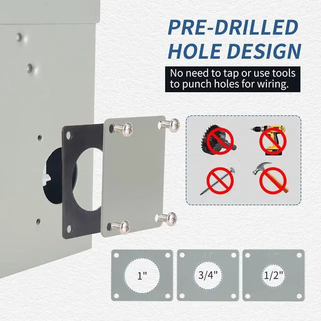 Pre-drilled Hole DesignThere are three pre-drilled replacement kits in different sizes to directly replace the knockouts on the four sides of the box, the knockouts can be replaced simply by unscrewing the screws.