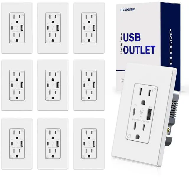 ELEGRP USB Charger Wall Outlet, 15 Amp Duplex Tamper Resistant Receptacle Plug with Type A & Type C USB Ports NEMA 5-15R, Wall Plate Included, UL Listed (10 Pack, Matte White)