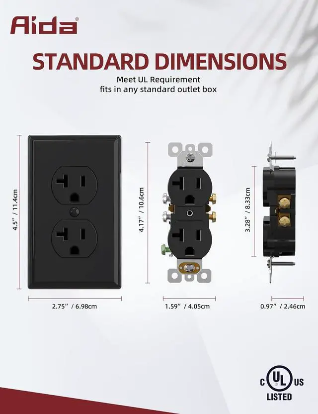 Safe and Secure Our AIDA duplex receptacle is UL-listed and has undergone rigorous quality testing to meet the highest industry standards of safety and performance, giving you peace of mind and an added level of safety for your electrical system. Trust in our product for the safety of your home and family.