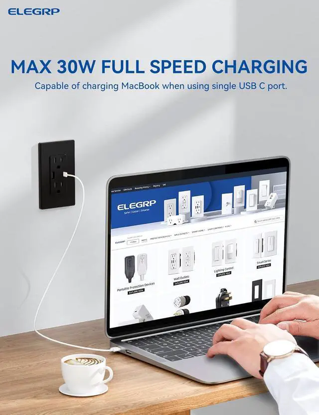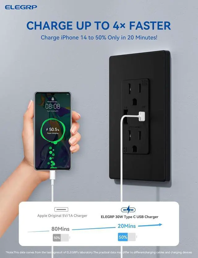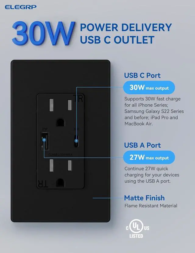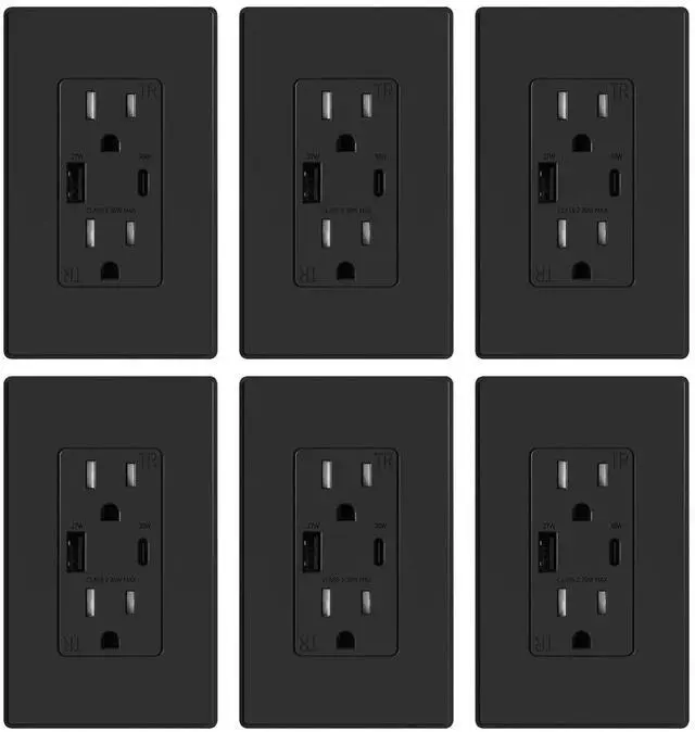ELEGRP USB Outlet Receptacle, 30W Fast Charge & Power Delivery USB C Wall Outlet, 15 Amp Wall Outlet with USB Ports, Tamper Resistant, UL Listed, Wall Plate Included, 6 Pack, Matte Black