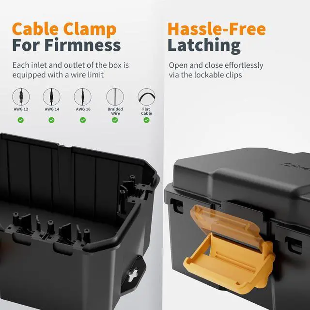 Waterproof Tips: Please place the box parallel to the ground, prevent place it vertically or obliquely; To avoid breaking the seal, do not place more than one cable in each port; Do not submerge the electrical box in water or bury it.