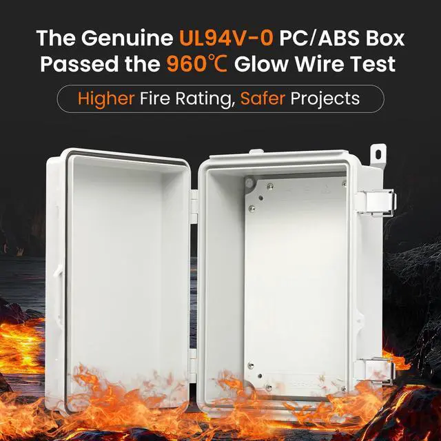 UL94-V0: We understand that customers seek a superior flame-retardant junction box due to fire safety concerns. That' s why we have engineered this enclosure box with UL94-V0 rated flame retardant material, capable of passing the 960°C Glow-Wire Test for exceptional fire protection. By choosing our enhanced flame-retardant electrical box, you can confidently eliminate fire hazards and secure the peace of mind you desire, especially for critical electrical applications