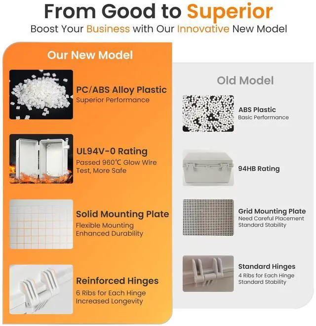 Upgraded Material: This outdoor electrical box is crafted with upgraded premium PC/ABS alloy plastic, delivering superior durability and impact resistance compared to traditional ABS plastic, ensuring a more reliable and advanced solution for your various applications. Whether you are a personal DIY enthusiast, a business customer, or a government client, this product is thoughtfully engineered with you in mind to minimize maintenance and replacements, offering dependable performance for the long term
