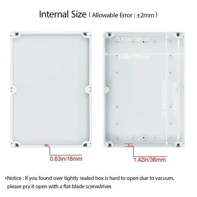 Inner Size of electronic enclosure: 10 x 6.9 x 1.81 inch (255 x 175 x 46 mm) (L*W*H) - - *Tips: in order to confirm the detailed installation dimensions, please refer to our detail image, which shows specific internal dimensions of the product. (Allowable