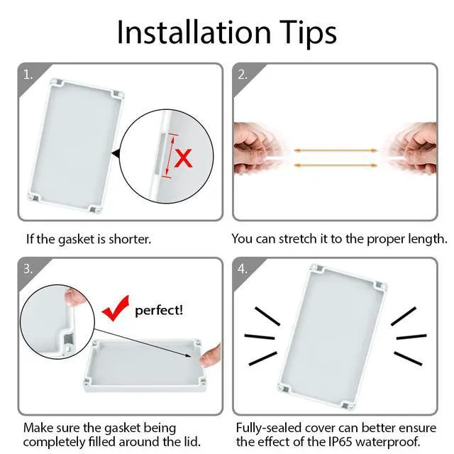 Contents & Service 1x Junction Box; 1x Rubber grommet for cover; 4x Screws. If you have any questions about the electrical enclosure box you received, please feel free to contact us and we will solve the problem for you.