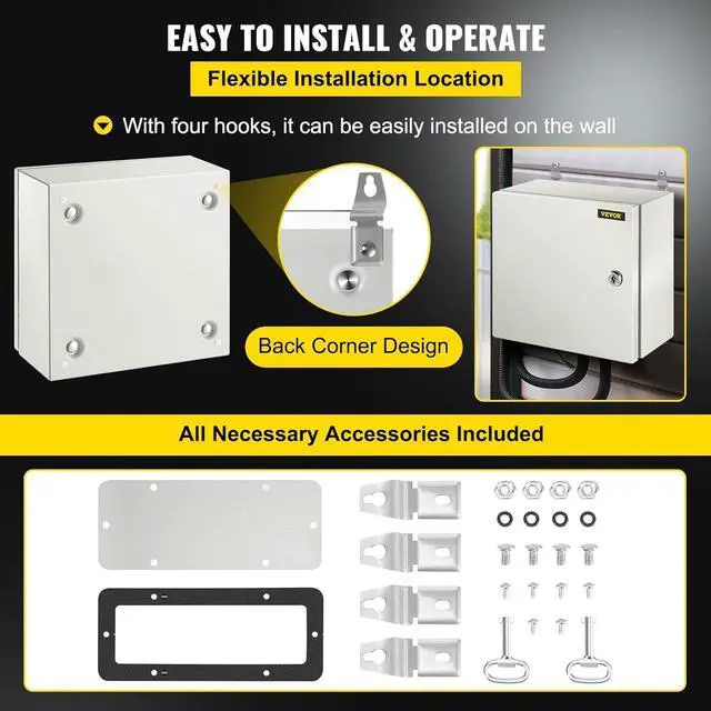 CONVENIENT INSTALLATION- The metal enclosure box is equipped with a removable galvanized mounting backplate to facilitate installing the electrical components. Complete accessories and four wall mounting holes in the back make it easy to fix the wall' s electrical box.