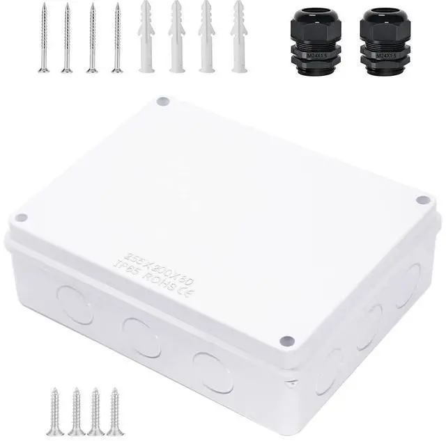Package Content 1x Junction Box including 4 x Self-tapping Screws (M3*15) for fixing the cover; 2 x M24 Cable Gland; 4x Self-tapping Screws (M5*40) for fixing on the wall; 4x Expansion Bolt. You can easily use the included accessories to complete your all DIY projects.