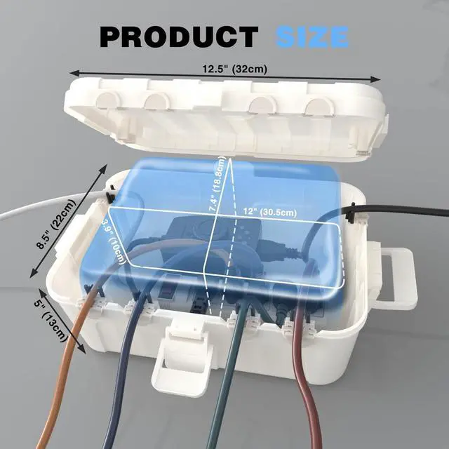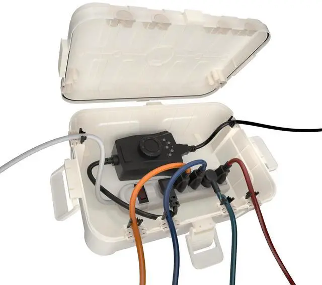 Designed to keep outdoor temporary cord connection secure and protected. Great for keeping Christmas inflatable decor running while safeguarding its electrical safety. Features with large size ( 12.5 x 8.5 x 5 inch) and 6 cable entry ports (front*4 + side*2), it is one-stop solution to protect outdoor power strip, timer outlet plug, extension cord, large adapter and most of other electrical connections.