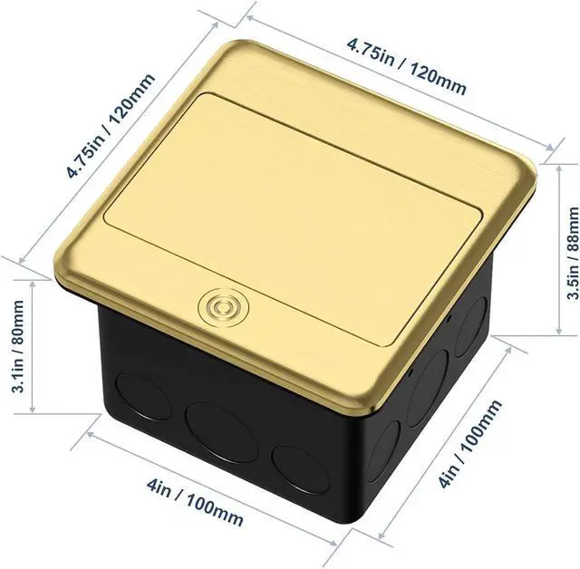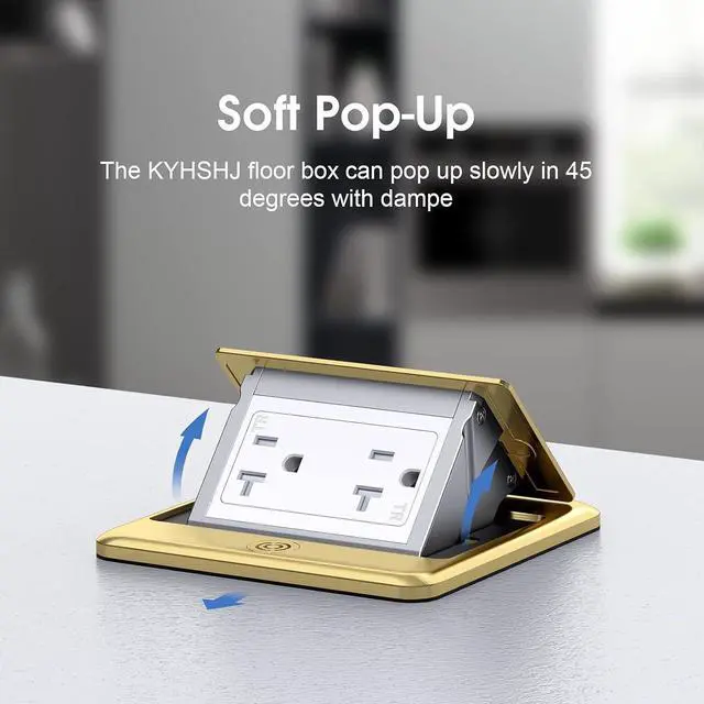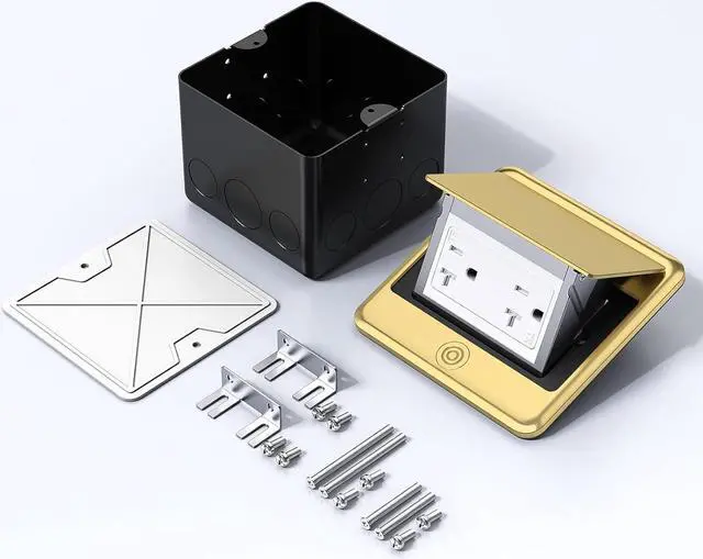 Product composition: Includes a hard material solid Brass floor box flip up cover with twisting lock, one 20A duplex tamper resistant receptacle, one galvanized steel junction box with 12 side and bottom knockouts. Adding dampers makes the product slowly open(There are two brackets in package to stabilize and keep it from being pulled out of the wood floor, counter top or kitchen island.