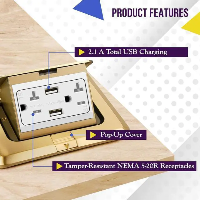 Features 2.1A total USB charging, durable 20A tamper-resistant receptacles, and non-corrosive hardware to ensure longer product lifespan