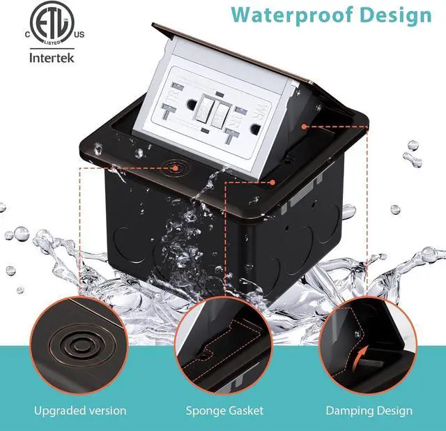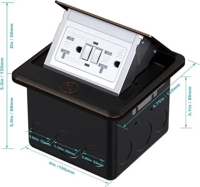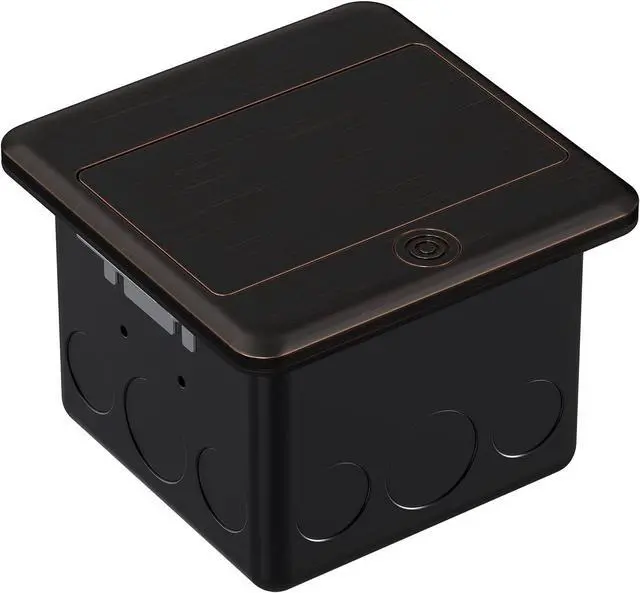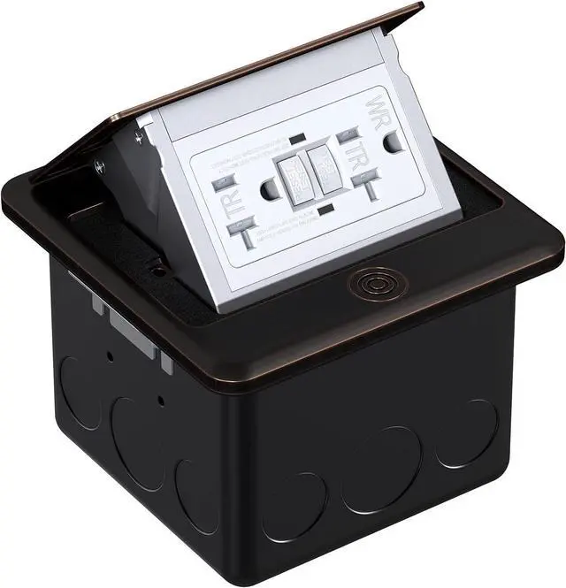 Floor Box Kit: Includes a stainless steel material solid oil rubbed bronze floor box flip up cover with twisting lock, one 20A GFCI duplex tamper resistant receptacle, one galvanized steel junction box with 12 side and bottom knockouts.