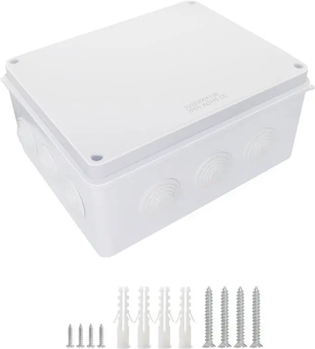[ Package Contents] 1 x plastic junction box; built-in rubber grommet; 4 x stainless steel screws for box cover; 4 x self-tapping screws for box mounting; 4x expansion bolt.