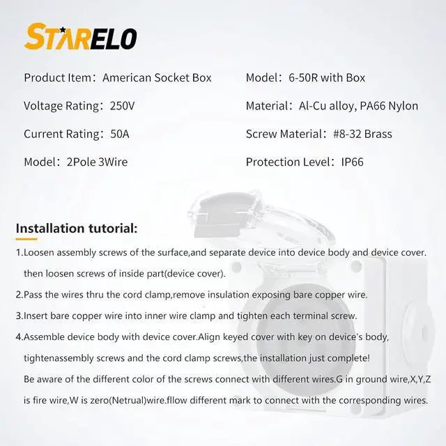 STARELO 50Amp Power Outlet Box,NEMA 6-50R Receptacle,250Volt Heavy-Duty Outdoor dustproof and Weatherproof for Electric Vehicles, generators, Welding Machines, etc.ETL Listed.(NEMA 6-50R Box)