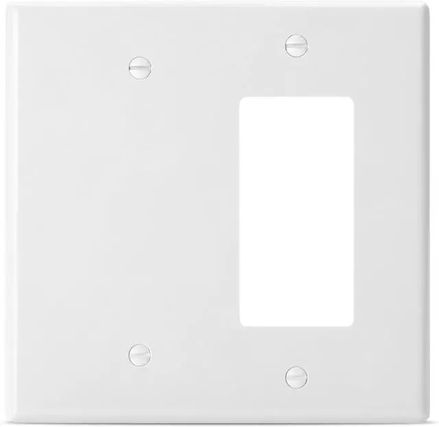 Package includes 1 pc of 2-gang 1-blank wall plate and 4 matching screws. The white finish on these wall plates is perfect for use in the home or office environments and will match any color of wall! Bates 2-gang 1-blank wall plate is made of unbreakable polycarbonate thermoplastic; this wall plate can withstand hard impacts and heavy force. It's also flexible and will not break or crack easily. Our wall plates are made to match any standard configuration and measure 4.9 x 4.8.. Plus they're easy to install - simply screw them into place using the included hardware and you're done! These white wall plates can beautify your house and match your room better; their smooth glossy finish and soft edges without recessed lines allow easy cleaning.