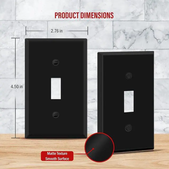 Powder Coated Stamped Steel provides high-impact resistance against heavy force.; enhances safety by limiting access to wiring due to wall plate breakage associated with nylon and plastic coversCorrosion-resistant material helps extend wall plate life in extreme environments; non-combustible and heat resistant to temperatures over 100 degreesEasy replacement of any wall plate of the same configuration; standard size dimensions: 4.50 height x 2.76 lengthFeatures a matte black color finish; premium quality finish with soft edges allows for easy cleaning and durable shineIncludes matching screws