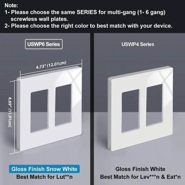 Size: Height 4. 69 ( 11.91 cm) x Width 4.73 ( 12.01 cm) x Depth 0.28 ( 0.71 cm). Covering more space than regular decorator wall plate with screwsUSWP6 series for snow white color and USWP4 series for white color. To match your outlets/switches please select the right series and color