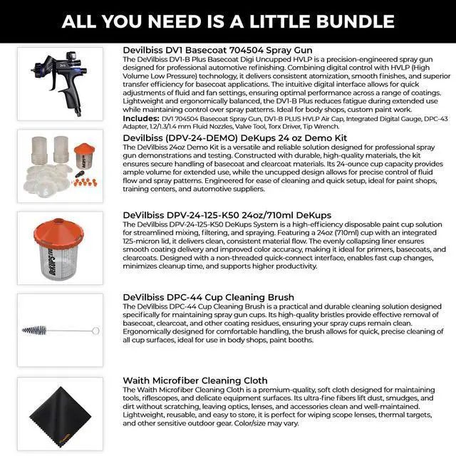 This professional Bundle Kit also includes the (DPV-24-DEMO) EVO 24 oz DeKups System, offering fast, contamination-free paint mixing and spraying with minimal waste. Devilbiss DPV-24-125-K50 24oz/710ml DeKup Kit, featuring a collapsible liner and integrated 125-micron filtration for superior material flow, accurate color matching, and a sealed, contamination-free system. A (DPC-44) 13-inch Cup Cleaning Brush ensures thorough maintenance of cups and components, while a premium microfiber cleaning cloth supports proper gun care and polished finishes. Together, these accessories enhance workflow efficiency and support the DV1s industry-leading performance in delivering smooth, consistent, and high-quality basecoat applications.